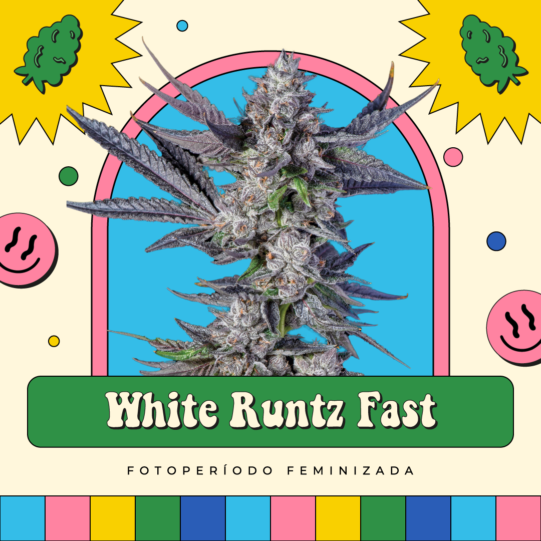 Sobre a Genética: Versão de floração acelerada desenvolvida para reduzir o ciclo da White Runtz mantendo o perfil doce, a alta produção de resina e a qualidade visual. Planta de porte médio, boa ramificação e flores densas, muito resinadas e com excelente desempenho em indoor.